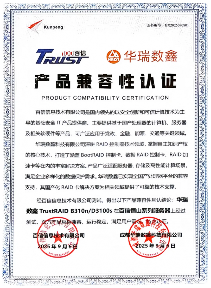 「华瑞数鑫」TrustRAID控制卡与「百信」恒山服务器完成兼容性认证