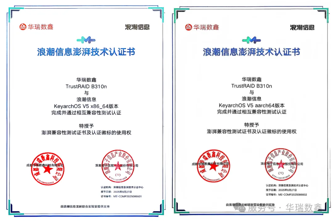 近日,「华瑞数鑫」(全称“成都华瑞数鑫科技有限公司”)宣布,其TrustRAID B310n系统RAID卡与「浪潮信息」服务器操作系统云峦KeyarchOS V5正式通过浪潮信息澎湃技术认证。