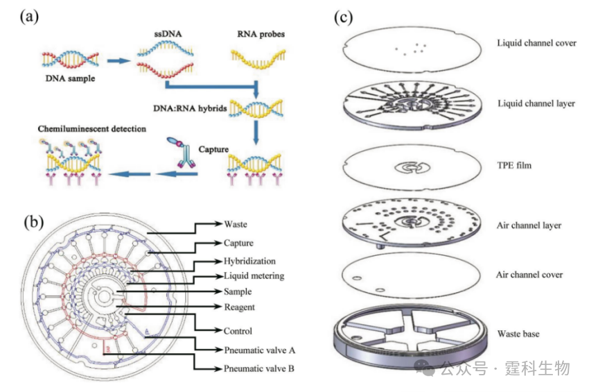 图1通过(a)原理示意图、(b)结构示意图、(c)层状结构图三个子图,系统展示了微流控芯片的杂交捕获原理、核心结构设计及物理分层,为理解芯片的技术逻辑与功能实现提供关键视觉支撑。