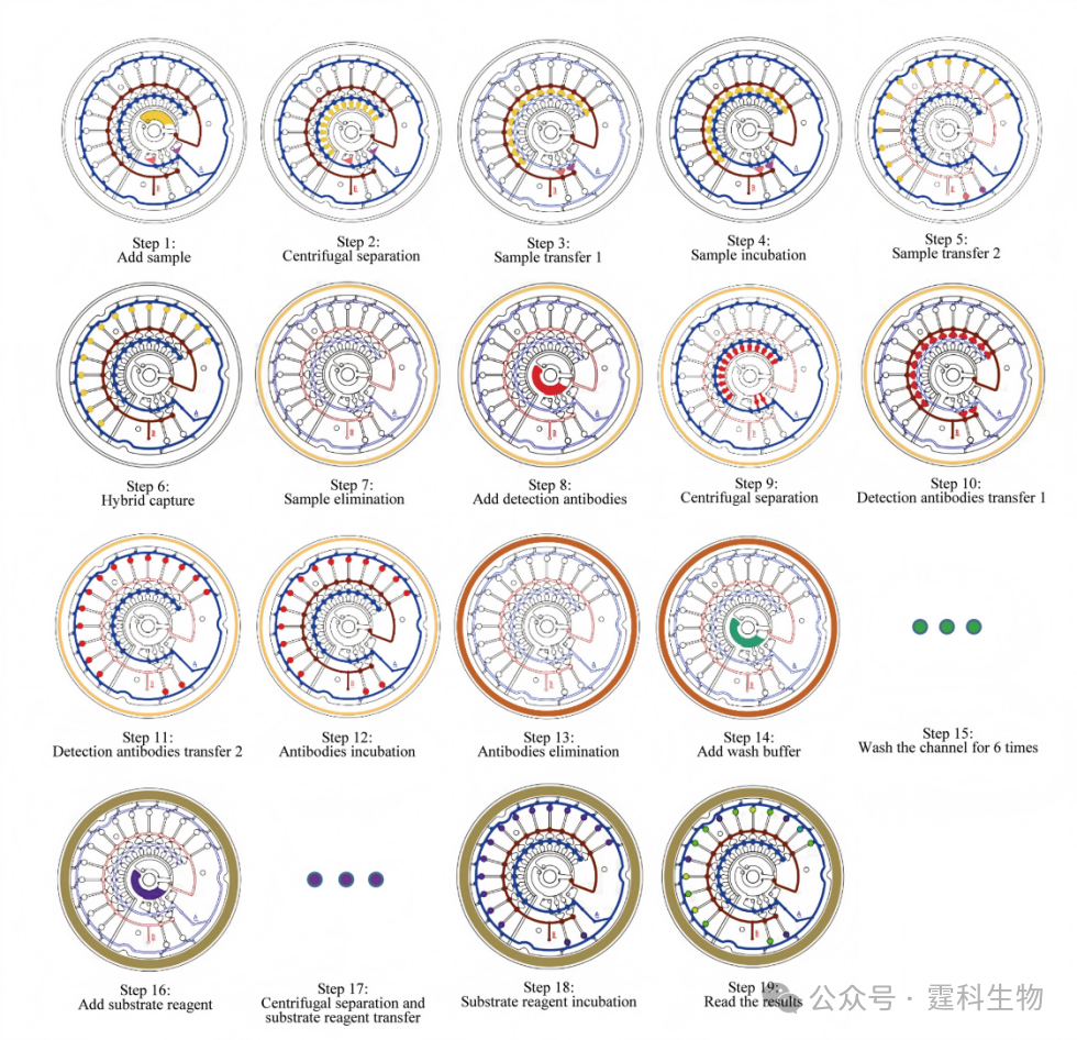 图2以步骤化流程图的形式,直观展示了样本、试剂在芯片内的全流程转移路径与阀门控制逻辑,清晰呈现了 “从样本加载到信号检测” 的整个过程,是理解芯片全自动化操作的核心依据。
