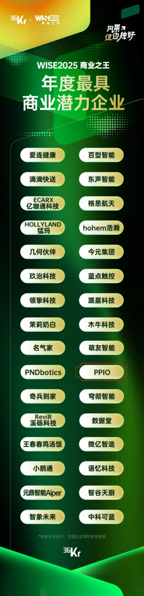 磐霖资本被投企业「沃飞长空」、「PPIO」上榜36氪「WISE2025 商业之王 年度企业系列名册」