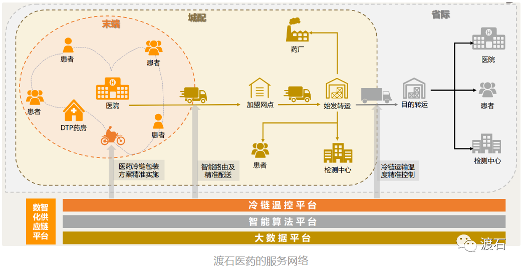 如何在加强医药流通安全的同时降低费用,成为摆在医药冷链服务商面前的重要任务。为此,由一群医药冷链领域及数据领域的资深人士发起成立的渡石医药供应链,搭建了一套 “数智化医药网络履约平台”:以技术驱动,用自营+平台的模式,最大程度建立以科技替代人工,提高医药冷链的质量;用专属网络提升规模效应,降低履约成本。