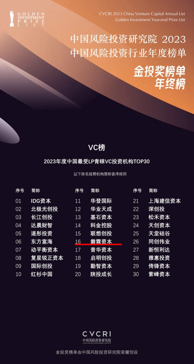 1月24日,「中国风险投资研究院·2023中国风险投资行业年度榜单•金投奖榜单•年终榜」隆重揭晓,从募、投、管、退、综合影响力等维度全方位考量,对在过去一年中国风险投资行业取得优异成绩和卓越贡献、创造社会效益的投资机构进行表彰。磐霖资本获评「2023年度中国最受LP青睐VC机构Top30」。