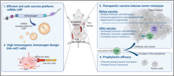 其次,与其他在研的HPV治疗性mRNA疫苗相比,复诺健科研团队采用新型抗原自佐剂设计,该mRNA治疗性疫苗可通过靶向识别免疫呈递细胞实现更高效的激活抗肿瘤细胞免疫,从而取得更为显著的肿瘤治疗结果。