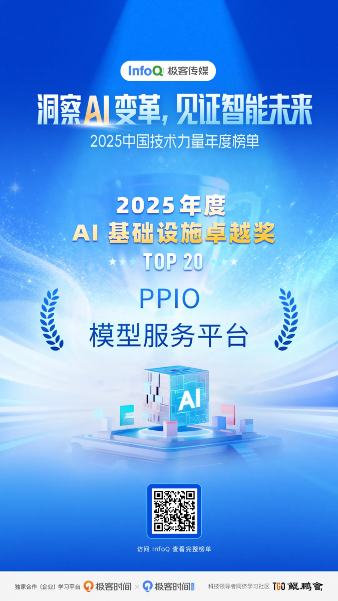 近日,InfoQ「2025 中国技术力量年度榜单」正式发布,「PPIO」模型服务平台凭借在分布式算力调度与模型推理加速领域的深厚技术积淀,与阿里云、腾讯云等行业巨头一并荣获「InfoQ 2025 年度 AI 基础设施卓越奖」。