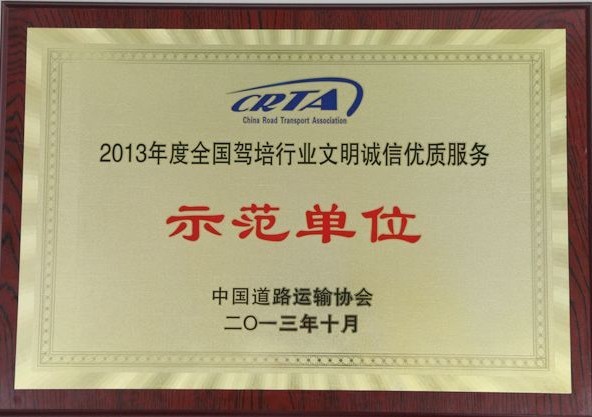 2013年10月,我公司获得由中国道路运输协会颁发“2013年度全国驾培行业文明诚信优质服务示范单位”荣誉奖牌,闫总在颁奖仪式上表示:荣誉的获得,是对我们为驾培行业做出的贡献的肯定,但是荣誉只代表昨天,在今后的工作中我们还将更加努力,承担起更多的社会责任,不断进取,引领先锋。